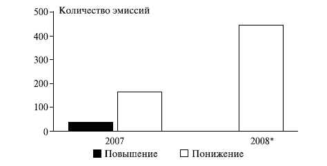 Рис. 11.10. Количество выпусков CDO высшего инвестиционного рейтинга, которым рейтинговые агентства снижали рейтинг (выделено черным)