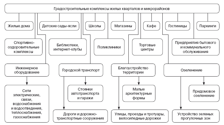 Жилая среда должна создавать благоприятные условия для обеспечения всех сфер жизнедеятельности населения. Она включает жилые дома, объекты общественного обслуживания, транспортные коммуникации и паркинги, рекреационные зоны. На рис. 1.1 представлен состав объектов жилой среды.