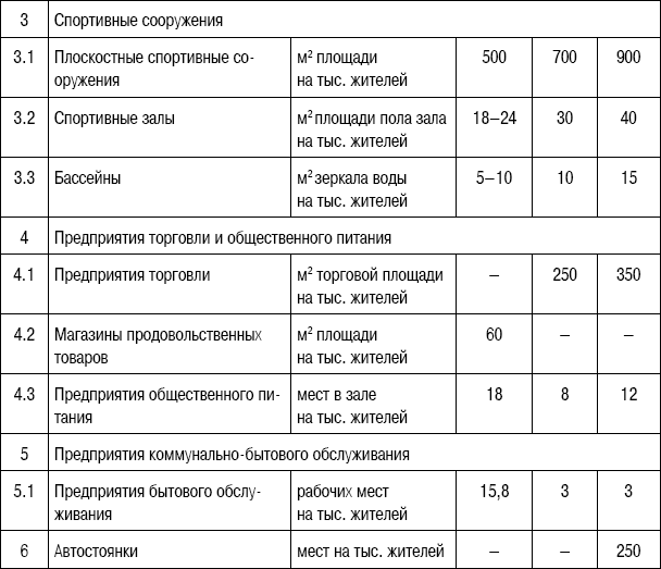 В системе градостроительных нормативов ведущее место принадлежит нормам жилищной обеспеченности, поскольку в соответствии с ними определяется плотность населения в новых микрорайонах и производится расчет инженерного оборудования и вместимости учреждений социально-бытового назначения. Согласно данным, приведенным в табл. 1.1, в Санкт-Петербурге рекомендуется принимать среднюю жилищную обеспеченность населения 28 м2 общей площади на жителя (в сравнении с 1985 г. она увеличивается в 2 раза); повышаются нормативы потребности в спортивных сооружениях, несопоставимы показатели обеспеченности в предприятиях торговли, общественного питания.