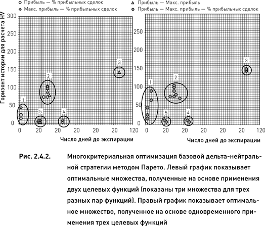 Двигаясь от простого к более сложному, рассмотрим сначала оптимальное множество Парето, полученное путем применения двух критериев. Из трех целевых функций можно составить три пары критериев, что позволяет получить три варианта оптимального множества. Узлы, попавшие в эти оптимальные множества, группируются на координатной плоскости в пяти областях. На левом графике рис. 2.4.2 эти области обозначены условными порядковыми номерами. Интересно отметить, что ни в одну из пяти областей не попали все три варианта оптимального множества. В третью область попал единственный узел множества, полученного в результате применения целевых функций «прибыль» и «максимальная просадка». Узлы, выбранные этой парой функций, попали также во вторую и пятую области. Узлы, соответствующие паре функций «прибыль» и «процент прибыльных сделок», расположены в первой, второй и четвертой областях. И, наконец, узлы, попавшие в оптимальное множество функций «максимальная просадка» и «процент прибыльных сделок», находятся в областях 1, 4 и 5. Такое распределение оптимальных множеств по областям координатной плоскости свидетельствует о том, что каждая из трех целевых функций вносит свой вклад в поиск оптимального решения. Поэтому в данном случае имеет смысл включить все три функции в систему многокритериальной оптимизации по методу Парето.