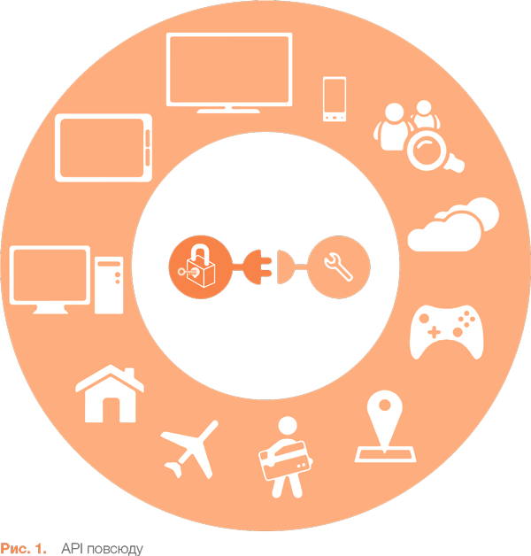 Компания выпускает спецификации API для широких масс или выбранных сторон таким образом, что другие разработчики могут проектировать совместимые продукты. Он связывает устройства, процессы, сервисы и программное обеспечение в цифровой экосистеме (рис. 1).