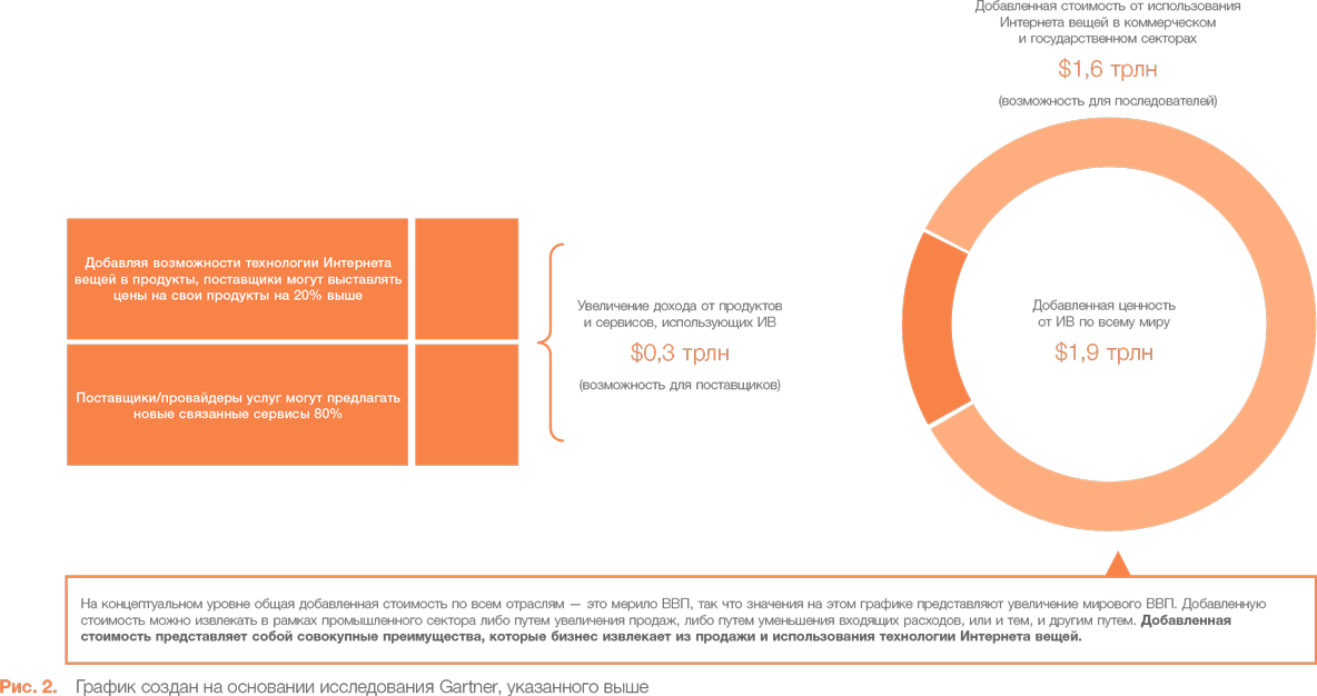 • Gartner прогнозирует, что общая экономическая ценность от Интернета вещей составит $1,9 трлн к 2020 г. во многих, почти всех, отраслях. Конечный показатель Интернета вещей вырастет на 35,2 % CAGR с 2013 до 2020 г., достигнув 25 млрд установок. В 2020 г. будет представлено 8,3 млрд «вещей», и более половины из них составят потребительские приложения. Интернет вещей будет поддерживать расходы на сервисы в размере $263 млрд в 2020 г.