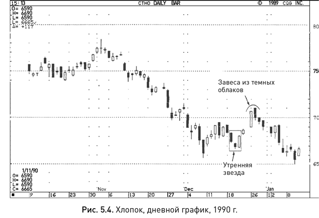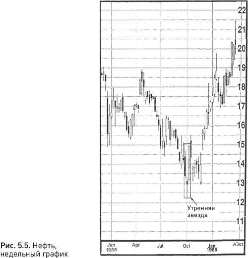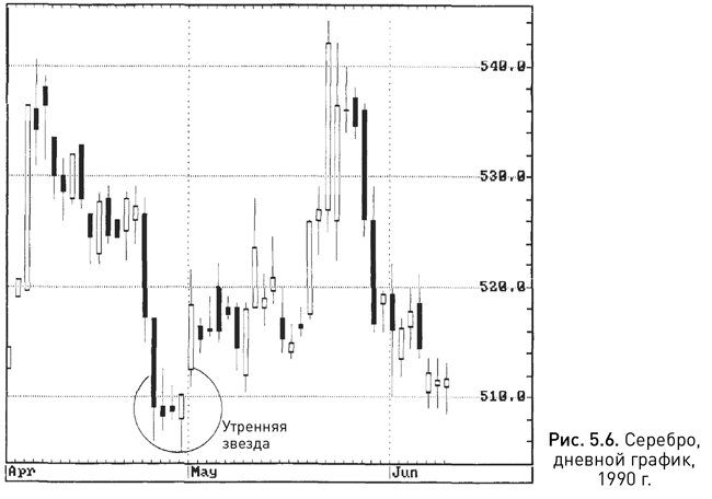 На рисунке 5.4 вы найдете утреннюю звезду, сформировавшуюся с 19 по 21 декабря. Начавшийся после нее подъем прекратился с появлением завесы из темных облаков 26 и 27 декабря. На рисунке 5.5 при образовании утренней звезды цены достигали многомесячного минимума. Обратите внимание, что черная свеча, идущая сразу за последней белой свечой утренней звезды, привела к образованию новой модели с медвежьим характером – завесы из темных облаков. Рост приостановился, тем не менее ниже минимумов утренней звезды рынок уже не опускался. На рисунке 5.6 показана одна из разновидностей утренней звезды: в нее входит не одна, а сразу три свечи с коротким телом. Примечательно, что третья свеча является молотом, а также образует с предыдущей свечой бычью модель поглощения.
