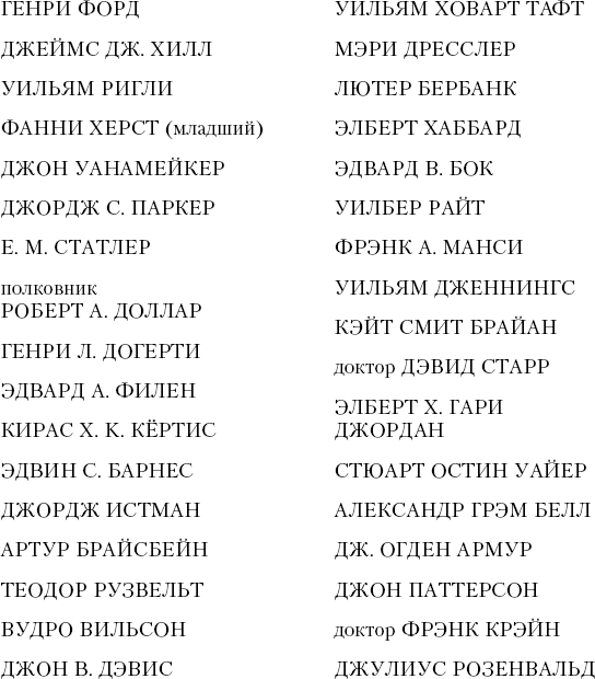 За 20 лет моего исследования, которое было задумано Эндрю Карнеги, я проанализировал истории сотен известных и весьма успешных людей. Многие из них сами признались мне, что они нажили свои великие капиталы с помощью «формулы Карнеги». Среди этих выдающихся личностей были: