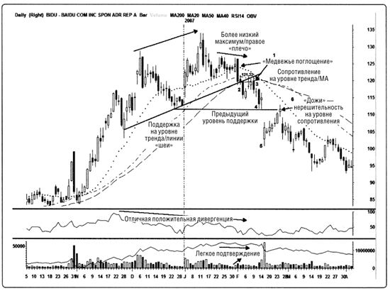 Рис. 12.1. Модель разворота на дневном графике Baidu.com (BIDU). Мы уже использовали недельный график Baidu.com (BIDU) в главе 10, чтобы проиллюстрировать фигуру «обратные голова и плечи». Здесь мы видим дневной график акций и отлично сформированные «голову и плечи» сверху. После почти двухнедельных попыток удержаться на уровне сопротивления над 20-дневной скользящей средней BIDU не смогли уйти наверх. В результате появился локальный максимум ниже предыдущего максимума. Поскольку цены ушли ниже и другого, более раннего максимума, сложившегося в начале декабря 2006 г., можно предполагать, что формируется фигура «голова и плечи» и что консолидация стадии 3 переходит в нисходящий тренд стадии 4. В то же время наш индикатор RSI подтверждает слабость, а OBV застопорился. Судя по всему, стоит внимательно понаблюдать за ситуацией. 1. Можно предположить, что формируется фигура «голова и плечи», любимая свинг– и позиционными трейдерами. О том, что контроль переходит к медведям, сигнализируют две комбинации свечей «бычье поглощение». 2. Спустя два дня, после плотной консолидации «дожи», возникла первая точка входа ниже скользящей средней, а также вторая точка входа в результате прорыва уровня поддержки на линии «шеи» ниже $119. 3. Этот прорыв оказался недолговечным, акции смогли опуститься всего на 4,5 пункта, после чего развернулись и начали ралли в обратную сторону, к бывшему уровню поддержки. Он превратился в уровень сопротивления, устоял, в результате чего появился второй сигнал к открытию «коротких позиций». Трейдеры, скорее всего, открывали их чуть ниже цены закрытия предыдущего дня $119,78, когда акции BIDU попытались прорваться через уровень сопротивления, но не смогли это сделать. Такая сделка позволяет вам открыть позицию вплотную к известному уровню сопротивления и тем самым разместить более близкий стоп (в данном случае – над максимальной ценой сессии $121,32). 4. Падение на много пунктов в зону потенциальной поддержки намного перевешивает наш первоначальный риск. 5. Связанный с объявлением о слабой прибыли гэп вниз и большой бонус для тех, кто еще не полностью закрыл свои короткие позиции. 6. Заполнение гэпа заканчивается «дожи» на уровне сопротивления. Однако после агрессивного гэпа вниз на следующий день мы бы за акциями охотиться не стали.