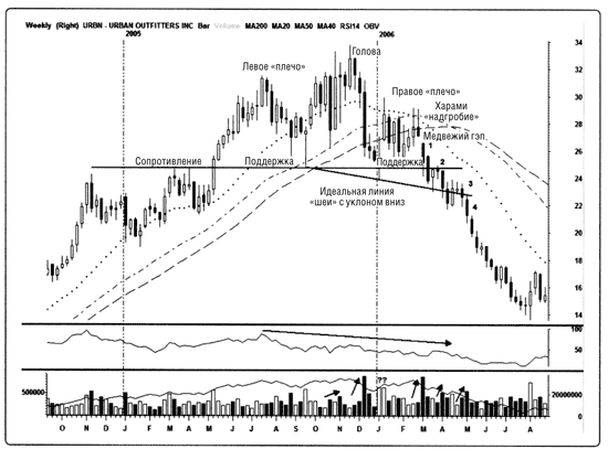 Рис. 12.2. Условия для открытия коротких позиций на недельном графике акций Urban Outfitters (URBN). Вот еще одна фигура «голова и плечи». На этот раз она сформировалась на недельном графике акций производителя модной одежды Urban Outfitters, Inc. (URBN). Видно, что возможности сыграть на понижение проявляются и на недельных графиках тоже. 1. В первой точке, где можно открыть короткую позицию, «харами» и «дожи-надгробие» указывают на уровень сопротивления, который сложился под скользящими средними, и формируют правое «плечо», причем RSI по-прежнему говорит о слабости рынка. За несколько недель до этого, когда фигура уже начала складываться, я отметила два подозрительных, следующих друг за другом по-бычьи выглядящих столбика объема. Позже, когда прошло достаточно времени и в результате движения акций URBN оказались выполненными другие наши критерии открытия позиций, появилась отличная возможность сыграть на понижение. Это подтвердил медвежий гэп почти в 50 центов шириной, хотя идеальный момент для входа и был упущен. В данном случае мы бы, скорее всего, открыли короткую позицию по правилу «первых 30 минут», ведь быки не смогли «заполнить» гэп и вернуть цены к сопротивлению на уровне скользящей средней. 2. После скольжения длиной в несколько пунктов к воображаемой линии «шеи» уровень поддержки предоставил отличную возможность для фиксации прибыли, когда сработали скользящие стоп-лоссы. Я назвала линию «шеи» «идеальной» потому, что эта наклонная вниз линия проведена по теням свечей. Мы говорили о том, что тела свечей представляют собой более надежные уровни поддержки и сопротивления. Неделю спустя на уровне поддержки образовались «дожи». Это была возможность открыть короткую позицию чуть ниже этой свечи, говорящей о нерешительности игроков, т. е. после того, как цены опустились ниже предыдущего минимума и линии «шеи». 3. Как оказалось, свинг-трейдеры, продававшие на прорыве линии «шеи», испытали разочарование. Прошло почти четыре недели, прежде чем обозначилось продолжение движения. 4. Сделка, совершенная после прорыва акциями URBN уровня поддержки на фоне самых больших со времени первого медвежьего гэпа объемах, быстро приносит прибыль.