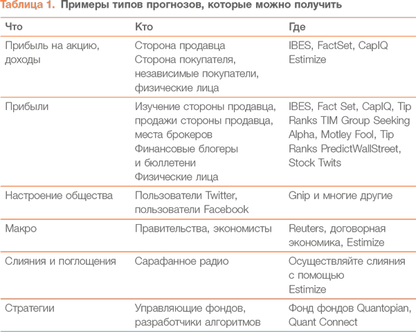Одним из первых был набор данных брокерского прогноза IBES (Institutional Brokers Estimates System (I/B/E/S, подразделение Thomson Reuters)). Сейчас эта идея стала широко популярна, а тогда она была новинкой: соберите прогнозы выручки брокеров на акцию и составьте из них консенсус-ожидание. IBES удовлетворяет наши нужды: это платформа для структурированных прогнозов, относительно свободных от мнений заинтересованных людей. Можно обсуждать, являются ли эти прогнозы достойными, но данные, бесспорно, интересны. Прогнозы отражают большинство наших желаний: существуют различные мнения, но в любом случае надо руководствоваться интернами бизнеса. И есть большой опыт аналитических прогнозов, что показано в работе, сделанной в StarMine, подразделении Thomson Reuters, а тогда, в начале 2000-х гг., независимой компании.