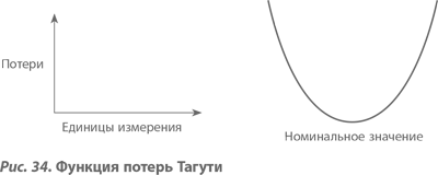 Значение показателя качества откладывается на горизонтальной оси, а вертикальная ось показывает потери, или вред, или значимость, относящиеся к значениям показателей качества. Эти потери предполагаются равными нулю, когда характеристика качества достигает своего номинального значения[50], во всех других случаях они положительны. Однако, отражая приведенную выше аргументацию, очень малые потери возникают, если характеристика качества достаточно близка к номинальному значению. Но по мере того как значения удаляются от оптимального, потери увеличиваются со всевозрастающей скоростью.