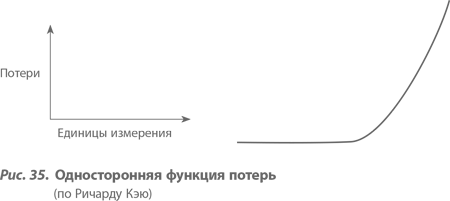 Мы также должны отметить, что иногда мы встречаемся с ситуацией, где функция потерь получается односторонней, как это показано на рисунке 35. Это тот случай, встречающийся во многих системах обслуживания, где уровень ошибок – существенная характеристика качества. Другие примеры включают процент содержания примеси в химикатах и время, которое мы хотели бы сделать настолько коротким, насколько это возможно, например время простоя, время погрузки и т. д.[52]