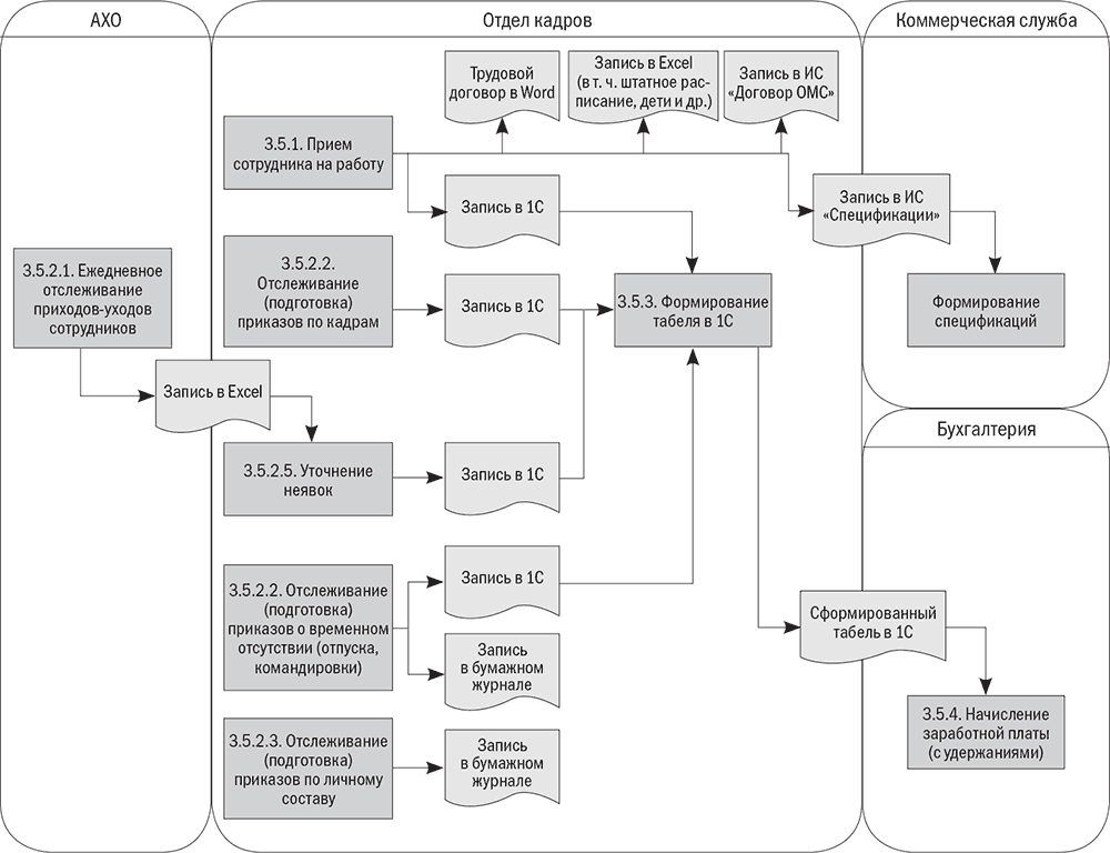 Теперь вернемся к схеме, представленной на рис. 8.2. Схема, размещенная на одном листе, описывает весь процесс кадрового учета в компании. В этом процессе задействовано четыре подразделения, начиная с административно-хозяйственного отдела. Сотрудник АХО фиксирует время приходов-уходов сотрудников в таблице MS Excel, а затем этим файлом пользуется отдел кадров, внося данные в табель в 1С. В табель попадает и другая информация – отпуска, командировки и т. д. Сформированный табель передается в бухгалтерию для расчета заработной платы. Передача осуществляется не в традиционном бумажном виде, а в электронном – в 1С. Но это не значит, что актива нет. Он существует в виде пополненной базы данных в информационной системе.