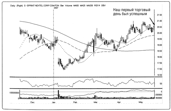 Рис. 14.4. Первый день торговли акциями Sprint Nextel Corp. (S). Дневной график Sprint Nextel Corp. (S) показывает, что первый день нашей торговли был успешным. Мы купили 500 акций по цене $20,48, а цена закрытия составила $20,63 при больших объемах торгов.