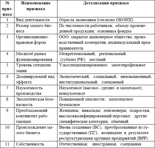 При этом особое значение имеет целенаправленное регулирующее воздействие на процесс формирования прогрессивной структуры малого бизнеса в регионе. Формирование такого рода структуры в перспективе дает возможность существенно повысить вклад малого бизнеса в ускорение экономического роста и успешное решение социальных задач территории. Для идентификации понятия «прогрессивная структура» целесообразно прежде всего выполнить классификацию малого бизнеса по совокупности важнейших группировочных признаков. В принципе могут быть выделены и детализированы следующие признаки (табл. 31).