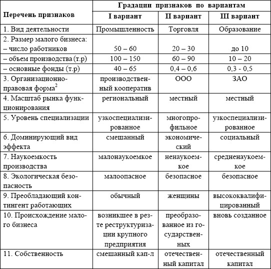 Более полное определение состава классификационных признаков позволяет идентифицировать типы малого бизнеса. При этом надо учесть все реально существующие и возможные в будущем комбинации вариантов, относящихся к каждому из 11 признаков малого бизнеса: от вида деятельности до преобладающего контингента работающих; от размера предприятия до доминирующего вида эффекта и т. д. В качестве методического примера три из множества возможных комбинаций охарактеризованы в табл. 32.