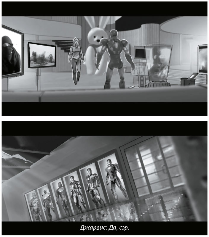 Рис. 5.1. Примеры предварительной визуализации для сцен фильма «Железный человек — 3» (студия Westlawn Productions). Это те техники, которые помогли Джорджу Лукасу стать первооткрывателем цифровых технологий киноиндустрии в приквелах «Звездных войн». «Пре-визы» включают в себя диалог, музыку и видоизмененные звуковые эффекты, которые соответствуют смысловой нагрузке сцены. В фильме финальный видеоряд был максимально близким к пре-визу, но в нем были задействованы настоящие актеры, настоящий звуковой ряд и итоговые спецэффекты