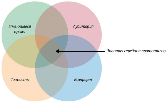 Как только вы набросаете черновик текста и обрисуете пользовательские сценарии, вам следует не откладывая приступить к созданию работающего прототипа, где работающий — это определяющее слово. Что именно считается для вашего продукта работающим, будет зависеть от того, где находится ваш продукт по отношению к пересечению следующих четырех множеств (рис. 5.2).