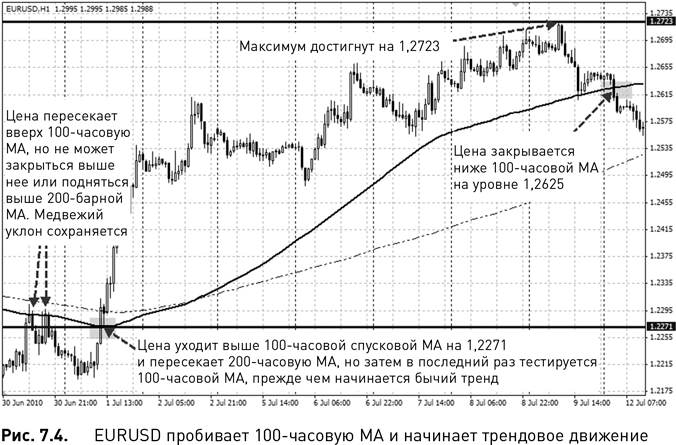 Рис. 7.4 представляет собой часовой график EURUSD, охватывающий период с 30 июня по 12 июля 2010 г. 1 июля (в левой части графика) EURUSD упирается в сопротивление на линии 100-часовой скользящей средней вблизи уровня 1,2271 (сплошная линия). Цена пробивается вверх, давая сигнал о покупке, затем быстро движется вверх.