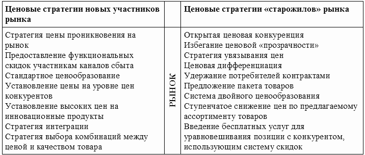 Ценовая политика имеет право “решающего голоса” в принятии решений по вопросам захвата новых рынков или удерживания существующих. Однако необходимо заметить, что ценовые стратегии, эффективные для новых участников рынка, не являются таковыми для “старожилов” рынка. И это понятно, поскольку цели, ресурсный потенциал, восприятие цен потребителями, интенсивность конкуренции, структура издержек, структура цен, правовые ограничения, связи с потребителями старых и новых участников рынка различны.