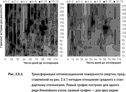 В отличие от трансформации методом усреднения (см. предыдущий раздел) ни одна из трех оптимальных областей не совпадает с оптимальными областями оригинального оптимизационного пространства. Это объясняется тем, что оптимальные области исходной свертки представляют собой узкие хребты и высокие пики. То есть эти области не достаточно робастны и обладают довольно ломанным рельефом. В противоположность этому три оптимальные области трансформированного пространства хоть и не расположены на самых высоких хребтах, зато находятся на достаточно гладких и широких плато средней высоты, что может быть предпочтительно с точки зрения их робастности. Поскольку эти три оптимальные области равноценны как по значению целевой функции, так и по робастности, выбрать из них одну можно по площади поверхности и по ее форме. При прочих равных условиях предпочтительно, чтобы оптимальная область имела большую площадь поверхности и более округлую форму (узкие области менее робастны по крайней мере по одному из параметров). Этим критериям соответствует область, расположенная в диапазоне 84–92 дней по параметру «количество дней до экспирации» и 155–175 дней по параметру «период истории для расчета HV».