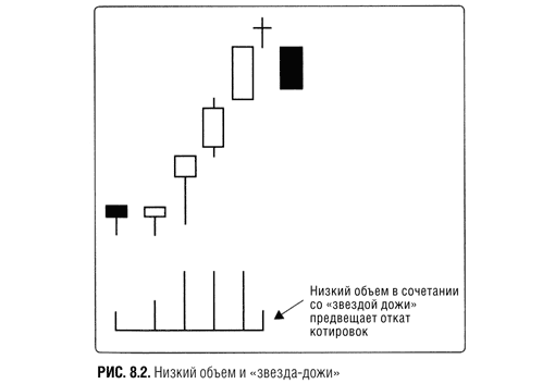 Еще один сигнал объема для свинг-трейдеров: если после двух-трех дней роста цены делают новый максимум, но похоже, что сессия закончится тем, что сформируется «дожи», «звезда» или «волчок» (свечи с коротким телом) на низком объеме, самое время фиксировать прибыль. Почему? Все эти свечи говорят о нерешительности участников рынка.
