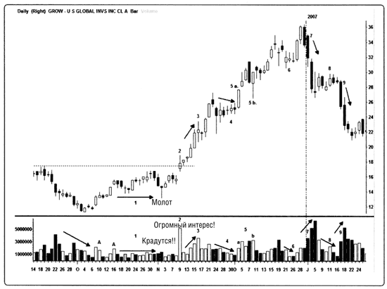 Рис. 8.3. Анализ объемов торгов акциями U. S. Global Investors (GROW). На этом дневном графике акций U. S. Global Investors (GROW), компании, предоставляющей услуги по инвестированию, можно увидеть, насколько важна роль объема торгов. 1. Обратите внимание на то, как резко падает объем во время формирования основания на стадии 1. Посмотрите также на накопление, отмеченное символом «А», и на «молот», появившийся украдкой, когда на арену вышли покупатели. 2. Прорыв уровня сопротивления на большом объеме. 3. Смотрите, как падает объем во время двухдневной «работы на дому» и как он затем возрастает после возобновления восходящего тренда. 4. Пауза в движении с многочисленными «дожи»/«волчками» и сильно снизившимся объемом. 5а. Преодоление ценами предыдущих максимумов и ралли в сочетании с объемами выше среднего, что подтверждает настроение покупателей. 5б. Выросший объем и широкий «молот». 6. Еще одна консолидация с «дожи»/«волчками» и низким объемом, говорящими о неуверенности. 7. Закончился 2006 г., и 2007 г. начался плохо – с комбинации свечей «бычье поглощение». Все возрастающая активность продавцов заканчивается парой очень волатильных дней и быстрым переходом к стадии 4, нисходящему тренду. 8. Техническая пауза на низком объеме. 9. К концу января диапазон расширился, уровень поддержки прорван, и возросшие объемы свидетельствуют о том, что медведи по-прежнему контролируют рынок.