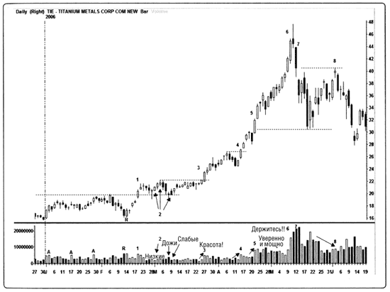 Рис. 8.4. Анализ объемов торгов акциями Titanium Metals (TIE). Вот еще один график, подтверждающий то, насколько важен объем для тех, кто следует за трендом, и для подтверждения признаков, что он выдыхается. Акции компании Titanium Metals Corp. (TIE) начали демонстрировать признаки аккумулирования в начале 2006 г. (значок А), хотя основание стало формироваться позднее. Там, где я отметила объем буквой R, я заметила дополнительные признаки покупателей, на этот раз в форме комбинации двух свечей, очень похожей на «просвет в облаках». Обратите внимание на то, как в эти дни быки выдали себя равными и одинаково высокими объемами! 1. Прорыв уровня сопротивления на объемах выше среднего. 2. Эти свечи указывают на точки входа 2 и 3 для открытия длинных позиций свинг-трейдерами. Хотя обе в итоге сработали, обратите внимание на то, насколько трудной была дорога наверх, поскольку объемы не подтвердили эти сигналы. 3. Теперь игра идет в полную силу: почти 5-недельное ралли на очень высоких, выше среднего, объемах. 4. Еще одна комбинация точек входа 2 и 3 на той же свече, но на этот раз на большом объеме! Видите, насколько легче торговать, когда объемы подтверждают сигналы? 5. Еще одно подтверждение силы восходящего тренда. 6. Бог ты мой!!! Они хотят еще? Этот энтузиазм, на самых больших за год объемах, спустя много дней после приемлемых моментов для открытия позиций свинг– и позиционными трейдерами, оказался истеричным по своей природе. 7. «Дожи-надгробие», за которым последовало подтверждение сигнала на рекордно высоком объеме, быстро переводит TIE на стадию 4, и формируется нисходящий тренд. 8. Комбинация «вечерняя звезда». Видите, как игроки еще раз тестируют предыдущую финальную стадию восходящего тренда, яростно набросившись на акции, и цены описывают почти параболу? Затем страх и устоявший уровень сопротивления снова толкают TIE вниз.