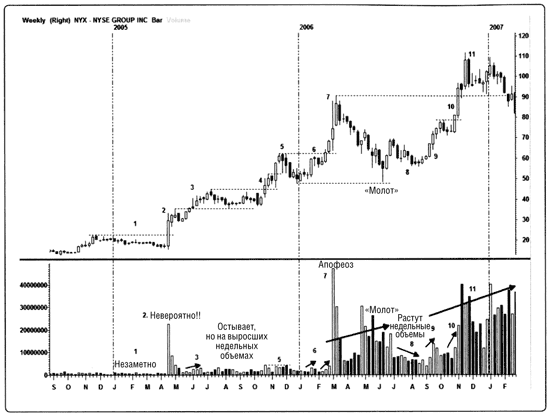 Рис. 8.5. Анализ недельных объемов торгов акциями NYSE Euronext (NYX). Давайте завершим наше изучение анализа графиков недельным графиком котировок NYSE Euronext (NYX), холдинговой компании-владельца Нью-Йоркской фондовой биржи. Учитывая то, что полностью переход со стадии 1 обычно занимает несколько недель, этот более длинный интервал времени может оказаться очень удобным. Многие позиционные трейдеры, в частности те, которые используют материалы IBD, зарабатывают с помощью таких графиков. Учитывая то, что на момент построения этого графика после IPO NYX прошло сравнительно немного времени и что для формирования истории таким акциям нужен более длительный срок, мы можем на этом графике наглядно увидеть, где просыпается интерес инвесторов – и какой интерес! 1. Т-с-с-с! Дремлем. 2. Инвесторы просыпаются и начинают покупать NYX. На фоне растущих объемов интерес инвесторов приводит к резкому рывку вверх. 3. Второй, хотя и меньших размеров, прорыв на выросших объемах. 4. Отрыв от основания на самых больших с момента 3, ставшего его началом, объемах. 5. Надвигаются неприятности. После роста на 17 пунктов от точки прорыва 4 недельные свечи закрываются ниже в условиях волатильных торгов и больших объемов. 6. Классическая недельная «ручка» (из модели «чашка с ручкой», которую мы изучим позже) и настоящий прорыв на возросшем объеме. 7. Апофеоз покупок спустя более 28 пунктов после точки входа. 6. Пора и отдохнуть! Черная свеча, но «молот» снизу говорит о том, что покупатели еще удерживают контроль. 8. Откат на уменьшившихся объемах. 9. Рост объема подтверждает движение наверх. 10. Еще один прорыв на высоких объемах и ценовом ралли. 11. После роста более чем на 30 пунктов «завеса из темных облаков» в сочетании с возросшими объемами говорит о том, что как минимум последнее движение выдохлось и покупатели демонстрируют признаки усталости.