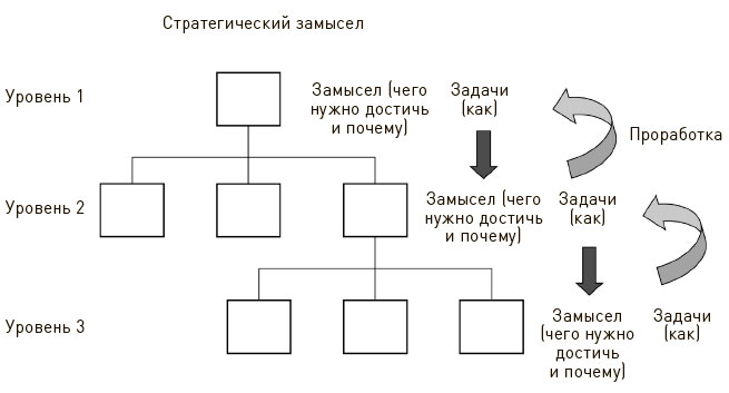 Опыт показывает, что, если замысел понятен только на один уровень выше, этого недостаточно, чтобы обеспечить согласованность действий в случае изменения ситуации. Польза от трех уровней выше незначительна. А двумя уровнями выше — как раз то что нужно, поскольку в этом случае люди могут ответить на вопрос: «Что мой руководитель хотел бы, чтобы я сделал, если бы он сейчас находился здесь и знал все то, что знаю я?»