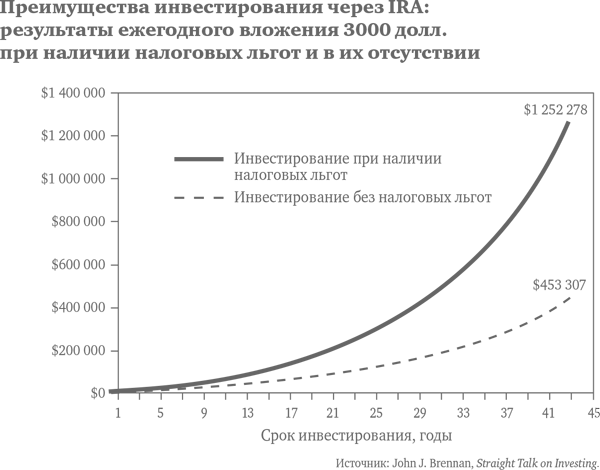 Начнем с простейшей формы пенсионных накоплений, с индивидуального пенсионного счета (IRA)[24]. Люди со скромными доходами могут ежегодно вкладывать до 3000 долл., например в какой-нибудь взаимный фонд, и полностью вычитать эту сумму из налогооблагаемого дохода. (На тех, у кого сравнительно высокий доход, право на подобные вычеты не распространяется, но у них есть другие налоговые льготы, о которых мы поговорим ниже.) При налоговой ставке в 28 % ваши фактические затраты составят всего 2160 долл., поскольку подоходный налог уменьшится на 840 долл. Можете считать, что правительство субсидирует ваш пенсионный счет. А теперь представьте, что ваши сбережения приносят 8 % процентов годовых, а вы продолжаете вкладывать по 3000 долл. каждый год на протяжении 45 лет. Доходы от средств, помещенных на IRA, не облагаются никакими налогами. Накапливая средства на IRA, вы получите через 45 лет 1,25 млн долл., тогда как без льгот IRA (т. е. с уплатой 28 %-ного налога со всех доходов) вы сможете скопить только 450 000 долл. Даже при уплате налога по ставке 28 % с суммы накоплений после их снятия с IRA (а по выходе на пенсию ставка подоходного налога нередко уменьшается) вы получите около 1 млн долл. График внизу показывает очевидные преимущества инвестирования при наличии налоговых льгот.