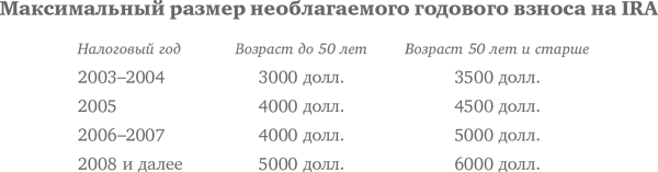 Условия накопления средств на IRA в скором времени должны стать еще выгоднее. Предел ежегодных взносов предполагается повысить до 4000 долл. в 2005 г. и до 5000 долл. в 2008 г. Более того, для граждан, которые не создали пенсионных накоплений своевременно и теперь вынуждены нагонять, предельный размер необлагаемого годового взноса еще выше.