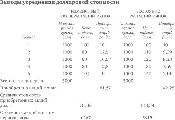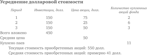 Усреднение долларовой стоимости означает просто-напросто, что вы в течение длительного времени вкладываете равные суммы денег в какой-либо взаимный фонд или во что-то другое через равные периоды времени, скажем, каждый месяц или квартал. Периодически инвестируя равные суммы в обыкновенные акции, можно уменьшить (но не устранить) риск того, что все акции будут куплены по временно вздутым ценам. Инвестор, регулярно вкладывающий равные суммы, купит меньше акций по завышенной цене и больше – по низкой цене. Как видно из приведенной далее таблицы, средние затраты на акцию оказываются ниже, чем средняя цена акций в период, когда осуществлялись инвестиции.