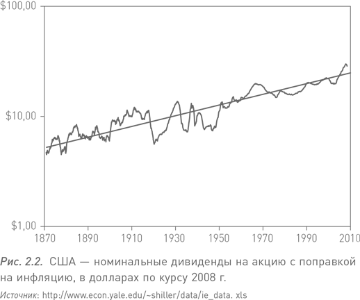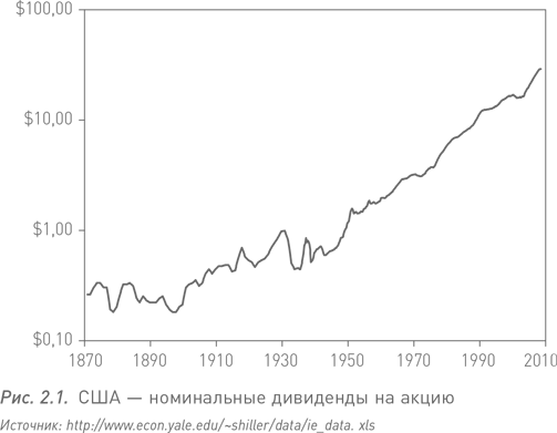 То же самое относится и к фондовому рынку в целом. В начале 2009 г. рынок США давал 3 % дивидендов. Каковы были темпы их роста? По этому вопросу специалисты по финансовой истории располагают очень хорошими долгосрочными данными. На рис. 2.1 показаны дивиденды по акциям S&P 500 с 1871 г. Обратите внимание, что примерно до 1940 г. они росли очень медленно, а затем стали увеличиваться куда быстрее.