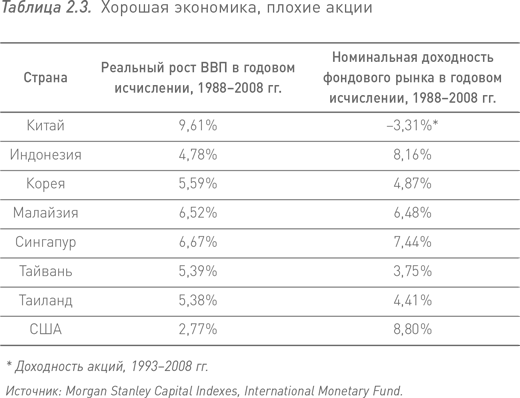 Таблица 2.3 показывает, что то же самое, хотя и в меньшей степени, относится к «восточноазиатским тиграм» – Индонезии, Корее, Малайзии, Сингапуру, Тайваню и Таиланду: доходность от акций здесь ниже, чем в США, где экономика растет не столь быстрыми темпами.