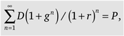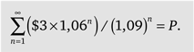 Возьмем акцию с дивидендами в $3, которые, по нашим предположениям, должны расти на 6 % в год. Предположим, что нетерпение инвесторов по отношению к этим деньгам в совокупности составляет 9 % в год. Тогда стоимость ее будущих дивидендов P равна: