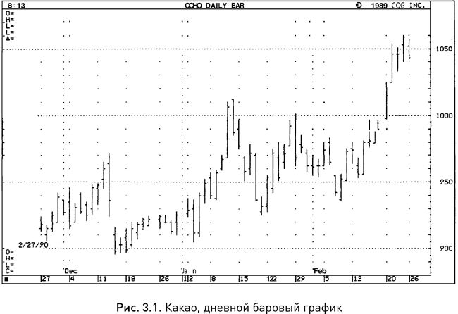 Различия между баровым и свечным графиками заметить нетрудно, хотя и тот, и другой содержат одинаковую информацию о ценах. При использовании свечей плоский, двухмерный баровый график как бы становится трехмерным: кажется, будто свечи пытаются покинуть пределы страницы, создавая стереоскопическую картину рынка. Сравните рисунки 3.1 и 3.2 – свечной график явно производит более яркое впечатление.