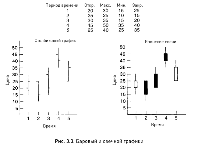 На рисунке 3.3 показаны баровый и свечной графики, которые построены на основе одних и тех же исходных данных. Широкая часть свечи называется телом (real body) и охватывает ценовой диапазон между ценами открытия и закрытия. Если тело свечи черное (то есть заполненное), значит цена закрытия была ниже цены открытия торгов, если белое (пустое) – наоборот, торги завершились на отметке выше той, на которой начались.