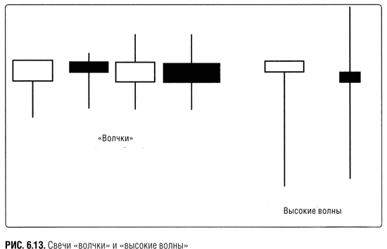 Последние виды свечей, которые мы обсудим, это «волчки» и «высокие волны» (рис. 6.13). «Волчками» называют свечи с короткими телами любого цвета. Длина их теней бывает различной. Можете считать «волчки» более мягкой версией «дожи». Их родственным видом являются «высокие волны», они похожи на «волчки», но с очень длинными верхними и/или нижними тенями.