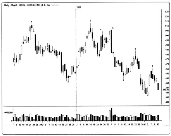 Рис. 6.14. Дневной свечной график Google (GOOG). Этот дневной график акций Google (GOOG) за период с ноября 2006 г. по март 2007 г. содержит несколько комбинаций свечей: 1. Комбинация «вечерняя звезда» наверху. 2. «Харами» внизу, за которой следует подтверждение «дожи». 3. Свеча «падающая звезда». 4. «Завеса из темных облаков», которая не сработала, но стала подготовкой к следующей комбинации. 5. Комбинация «медвежье поглощение». 6. Комбинация из трех свечей «утренняя звезда» с «просветом в облаках». 7. «Вечерняя звезда». 8. Комбинация «медвежье поглощение». Ни один из технических инструментов не предскажет будущее поведение цен в 100 % случаев, но мы можем видеть, что изучение основ анализа «японских свечей» определенно стоит потраченных на это усилий.
