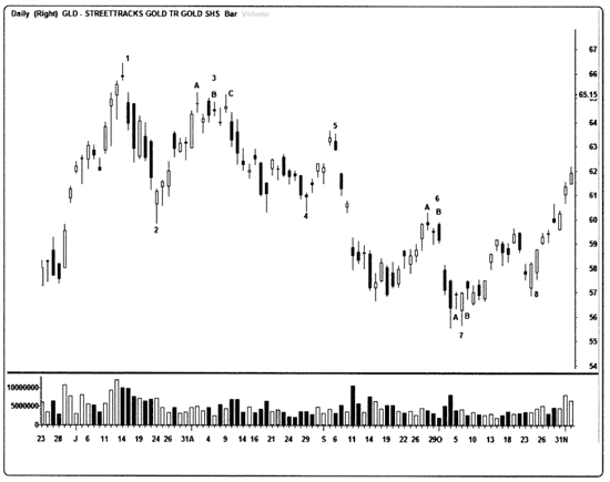 Рис. 6.15. Дневной свечной график streetTRACKS Gold Shares ETF (GLD). 1. «Падающая звезда» сверху. 2. «Молот» снизу. 3. Множество верхних комбинаций/свечей: А. «Вечерняя дожи-звезда». В. «Медвежий харами». С. Два «дожи-надгробия». Некоторые трейдеры могли бы посчитать последние три свечи «волчками». Независимо от названий свечи с «медвежьим» характером в конечном итоге привели к тому, что акции GLD развернулись вниз. 4. «Молот» снизу. Обратите внимание на то, как эта свеча, признак разворота, «упирается» в область поддержки на уровне неотмеченного «молота», сформировавшегося несколькими сессиями ранее. 5. Медвежья «завеса из темных облаков». 6А. «Вечерняя звезда». 6В. «Завеса из темных облаков» подтверждает максимум этого незавершенного движения. 7А. Бычья комбинация «харами» из двух свечей. 7В. «Молот» – подтверждение – все еще находящийся внутри тела первой длинной свечи первой комбинации. 8. Бычья комбинация «просвет в облаках».