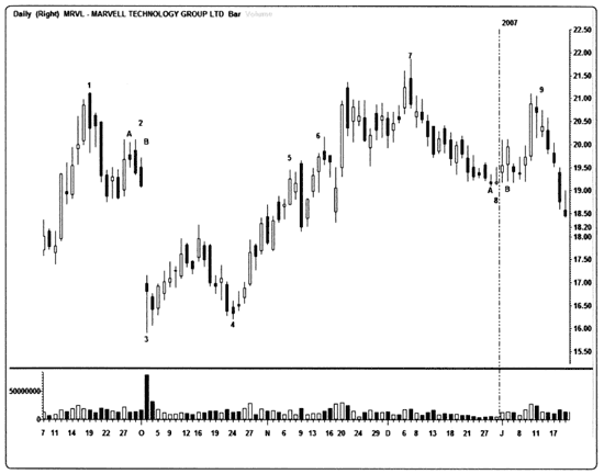 Рис. 6.16. Дневной график акций Marvell Technology (MRVL). При взгляде на этот дневной график Marvell Technology (MRVL) становится понятно, почему комбинации свечей считаются в среде трейдеров таким важным инструментом предсказания разворотов тренда. 1. Медвежья «завеса из темных облаков». 2А. «Харами». 2В. Подтверждение в виде «медвежьего поглощения». 3. «Молот» с большим разбросом цен, дополненный следующей свечой меньшего размера, формирует бычий «харами». 4. Бычья «утренняя звезда» из трех свечей. 5. Как я говорила, нет в жизни совершенства. Здесь мы видим две свечи «харами», за которыми следует очень большая комбинация «медвежье поглощение», ни к чему в итоге не приведшая. 6. «Вечерняя звезда» чуть лучше справляется с медвежьим прогнозом, но нужно было торопиться! 7. «Завеса из темных облаков» в данном случае срабатывает – с третьей попытки, – поскольку цены идут вниз. 8. Вот интересный минимум. 8А. Два «дожи-надгробия», но это не медвежий сигнал, поскольку такая последовательность появилась после сильного движения вниз и ее следует интерпретировать как потенциальный признак слабости медведей в их стремлении двинуть цены еще ниже. 8В. Здесь сформировалась последовательность из «высокой волны», «просвета в облаках» и трех «дожи», которые в итоге привели к катапультированию акций вверх. 9. Верхний «харами», за которым последовало второе внутреннее «надгробие» и медвежье движение вниз.