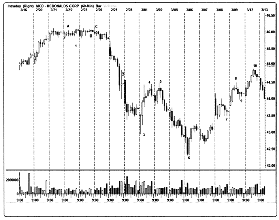 Рис. 6.17. 60-минутный график акций McDonald’s (MCD). Хотя до сих пор при анализе комбинаций «японских свечей» мы фокусировались на дневных графиках, свечи так же хорошо работают на любых интервалах времени. Вот 60-минутный график акций McDonald’s (MCD), на котором изображена динамика цен за три недели. 1А, В. Здесь мы видим нерешительность трейдеров, поскольку многочисленные «волчки» и/или «дожи» удерживают цену в очень узком диапазоне. 1С. Это «надгробие» могло стать ранним указанием на то, в каком направлении двинутся цены. 2. Выяснилось, что они пошли резко вниз. Видно, как перетягивание каната между быками и медведями вызвало «высокие волны». 3. Очень бычий «молот» после медвежьего не смог привести к серьезному прорыву вверх в результате серии нерешительных «дожи». 4. «Медвежье поглощение». 5. «Вечерняя звезда» и «повешенный» сверху. 6. «Просвет в облаках» снизу. 7. Бычий «харами». 8. «Надгробие» сверху. 9. Бычий «харами». 10. Комбинация «завеса из темных облаков» сверху.