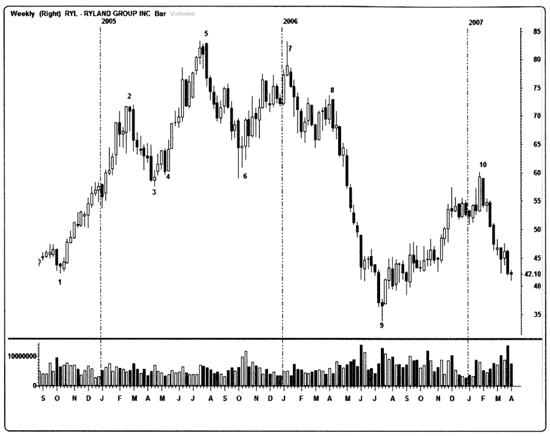 Рис. 6.19. Недельный график акций Ryland Group, Inc. (RYL). Этим последним примером, недельным графиком, мы эффектно закончим наш рассказ. Вы видите недельные результаты торгов акциями Ryland Homes (RYL) с конца 2004-го по 2007 г. 1. Начинаем с комбинации из трех свечей «утренняя звезда». 2. «Харами» из двух свечей сверху (может также считаться «повешенным»), сразу после нее следует подтверждение «медвежье поглощение». 3. «Утренняя звезда». 4. «Просвет в облаках». 5. «Медвежье поглощение». 6. Бычий «харами». 7. «Падающая звезда». 8. «Медвежье поглощение». 9. Комбинация «молот»/«утренняя звезда». 10. «Завеса из темных облаков». На самом деле я отметила не все комбинации, так что, если захотите, можете изучить график и найти остальные. Ни один инструмент не совершенен, когда речь идет о предсказании динамики цен, но в целом комбинации свечей остаются наиболее ценными индикаторами, которые мы можем использовать.