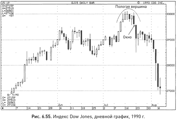 Пологая вершина (см. рис. 6.53) идентична закругленной вершине (rounded top) в западном техническом анализе и обычно состоит из свечей с короткими телами, которые следуют друг за другом по дугообразной выгнутой траектории. В конце обязательно должен образоваться гэп вниз, чтобы эта модель считалась завершенной.
