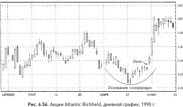 Основание «сковорода» формируется при нисходящем тренде: свечи как бы образуют впадину, а затем возникает гэп вверх (см. рис. 6.54). Эта модель похожа на закругленное основание в западном графическом анализе, только в данном случае обязательно должен образоваться гэп, или окно, как говорят японцы.