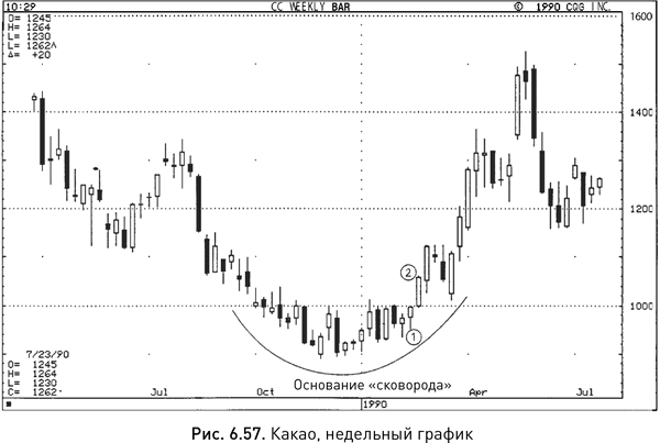 На рисунке 6.57 вы найдете другой хороший пример основания «сковорода». Подтверждением бычьего сигнала здесь служит свеча 2, хотя между ней и свечой 1 нет гэпа. Максимальная отметка первой свечи составляет $1000, а минимальная отметка второй – $997, то есть для гэпа не хватило символических четырех тиков. Кроме того, свеча 2 представляет собой бычий захват за пояс, что сигнализирует о готовности рынка к росту.