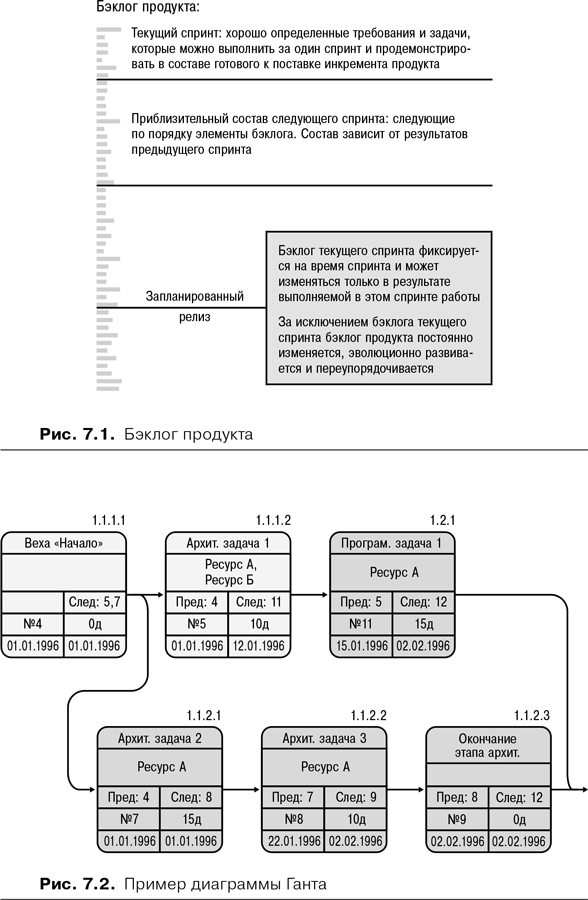 Как видно по рис. 7.2, диаграмма Ганта намного более впечатляющая и запутанная, чем список элементов бэклога продукта. В графическом виде она линиями показывает зависимости между задачами и обозначает их разными цветами. Но внешность бывает обманчивой: если диаграмма Ганта содержит требования вместо задач, она становится просто графическим представлением бэклога продукта.