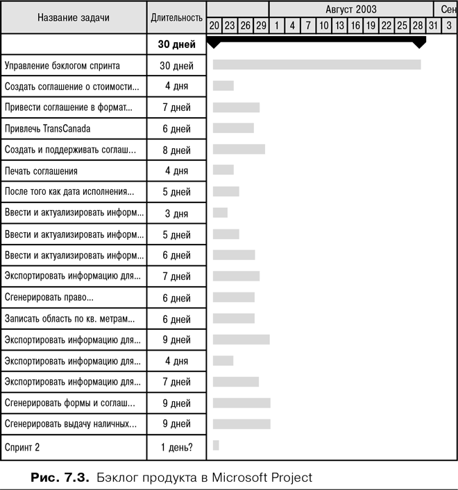 Рут открыла файл с электронной таблицей бэклога проекта в Microsoft Excel и создала новый проект в Microsoft Project. Она скопировала и вставила весь список элементов бэклога из Excel в Project в столбец «Название задачи», а оценки – в колонку «Длительность». Это был прямой перенос из одного продукта Microsoft в другой. Она сгруппировала требования (MS Project считал их задачами) в спринты, как показано на рис. 7.3.