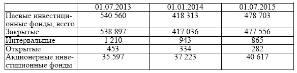 Количество паевых инвестиционных фондов в середине 2014 года составило 88, сократившись за год на треть. Количество акционерных фондов за то же время тоже сократилось, хотя и не так сильно, – до 27 единиц.