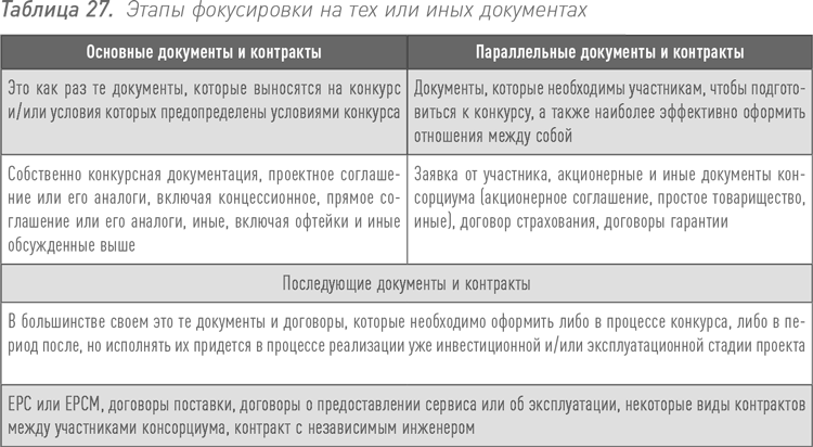 В первую очередь, как видно из таблицы 27, стоит обратить внимание на собственно конкурсную документацию. Инициатору необходимо внимательнейшим образом сосредоточиться на составлении КД, проработке ее ключевых условий, ключевых соглашений и документов, которые будут входить в массив КД на конкурсе. Значительные усилия стоит тратить на формирование самого офтейкерского пула и документов, его обеспечивающих.