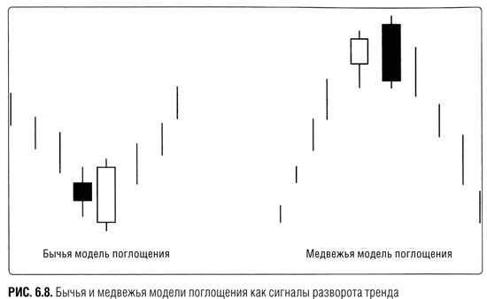 Следующая комбинация, предвосхищающая смену тренда, – это «поглощение». Она состоит из двух свечей противоположного цвета. Тело второй свечи должно полностью «поглощать» тело первой. Перевод таков: цена открытия второй свечи должна быть ниже цены закрытия первой, а цена закрытия второй – выше цены закрытия первой. Такая комбинация называется «бычьим поглощением». Ее противоположность – «медвежье поглощение». На рис. 6.8 они показаны в действии.