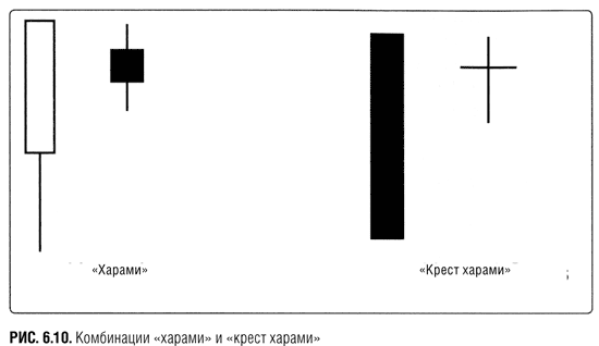 В этой комбинации длинное тело должно появиться первым, а короткое – вторым. (Когда происходит наоборот, это означает комбинацию «бычье поглощение».) Цвета свечей не обязательно должны быть противоположными, но обычно это так. «Харами» и «крест харами» показаны на рис. 6.10.